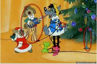 Мы нашли на данном кадре целых три фотоляпа: гитара в руке одного из персонажей, стойка возле елки и левая рука волка.
