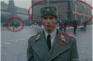 На нем 3 фотоляпа: звезды на воротнике у главного героя, чемодан вместо здания за спиной Шварцнегера и бегущий слева человек.
