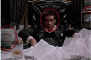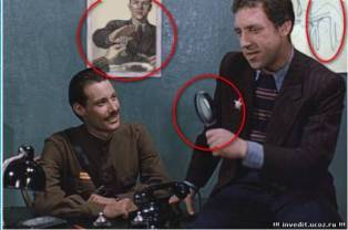 На данном кадре мы нашли 3 ляпа: над головой Шарапова висит плакат с молодым человеком, отказывающимся от проянутой рюмки, в верхнем правом углу, справа от Жеглова на стене лист с изображением "эмблемы" банды "Чёрная кошка", в руках у персонажа Высоцкого лупа.