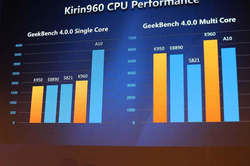 Тест Geekbench 4.0.0 показывается, что в одноядерном режиме Hisilicon 960 превосходит конкурентов от Qualcomm и Samsung, достигая планки в 2000 очков, но сильно уступает Apple A10 Fusion, способному выбить аж 3500 баллов. Зато в многоядерном тесте Kirin 960 вне конкуренции и обгоняет как Snapdragon 821, так и Apple A10, что обусловлено большим количеством ядер, одновременно включенных в тестирование. Показатель превышает цифру 6300 очков, тогда как конкуренты находятся ниже уровня 6000.