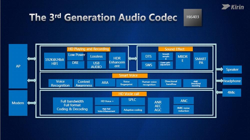В 2016 году многие производители сделали ставку на звук - некоторые убрали 3,5-мм разъем под наушники, так как он не может обеспечить должное качество звука, другие же оборудуют смартфоны отдельными аудиочипами. Компания Хуавей пошла по второму пути и внедрила в Kirin 960 аудиочип Hi6403, который отвечает за шумоподавление при работе с микрофоном (при разговоре) и обеспечивает отличное звучание в наушниках. Чип Hi6403 на аппаратном уровне поддерживает воспроизведение аудиоформатов High-end 32 бит/192 кГц и DSD. Что касается потребления заряда аккумулятора, то Hi6403 требуется на 30% меньше энергии, чем его предшественнику.