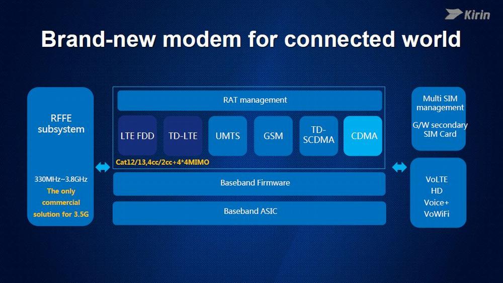 В микропроцессоре Kirin 960 имеется модем Balong (собственная разработка компании), который обеспечивает работу беспроводных сетей на скорости до 600 Мбит/с. за счет использования несущих частот 4x4 MIMO. Чип Кирин 960 оказался первым процессором китайского бренда, который позволяет устройству работать во всех сетевых стандартах: GSM, UMTS, CDMA, TD-SCDMA, TD-LTE, LTE FDD и 3GPP с рабочими частотами от 330 MHz до 3,8 GHz.