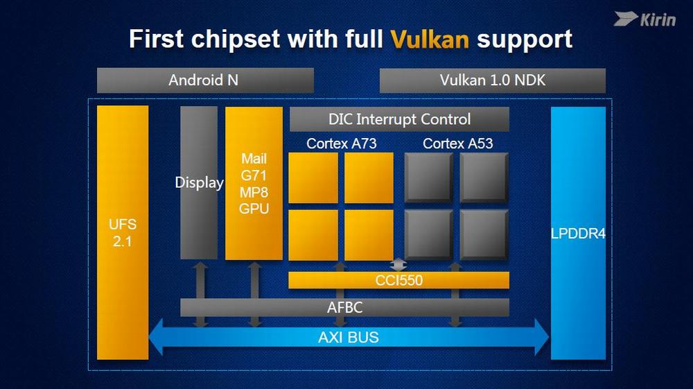 Что касается графического ускорителя, то новый Mali G71 MP8 - это буквально прорыв для британской компании-разработчика ARMi, так как предыдущая ее линейка Mali-T880 MP12 была на 40% слабее графики Adreno 530, применяемой в процессорах Snapdragon 820/821. Согласно данным, Mali G71 MP8 производительнее T880 MP12 на 180%, а сам чипсет Kirin 960 оказался первым из всех процессоров компании Хуавей, который получил 100% поддержку Vulkan API. Благодаря Vulkan API, который предоставляет разработчикам игр и приложений прямой доступ к ресурсам CPU и GPU, графика в играх существенно улучшится, а количество FPS возрастет. Этот самый прирост может составить от 40 до 400% в зависимости от игры и от смартфона.