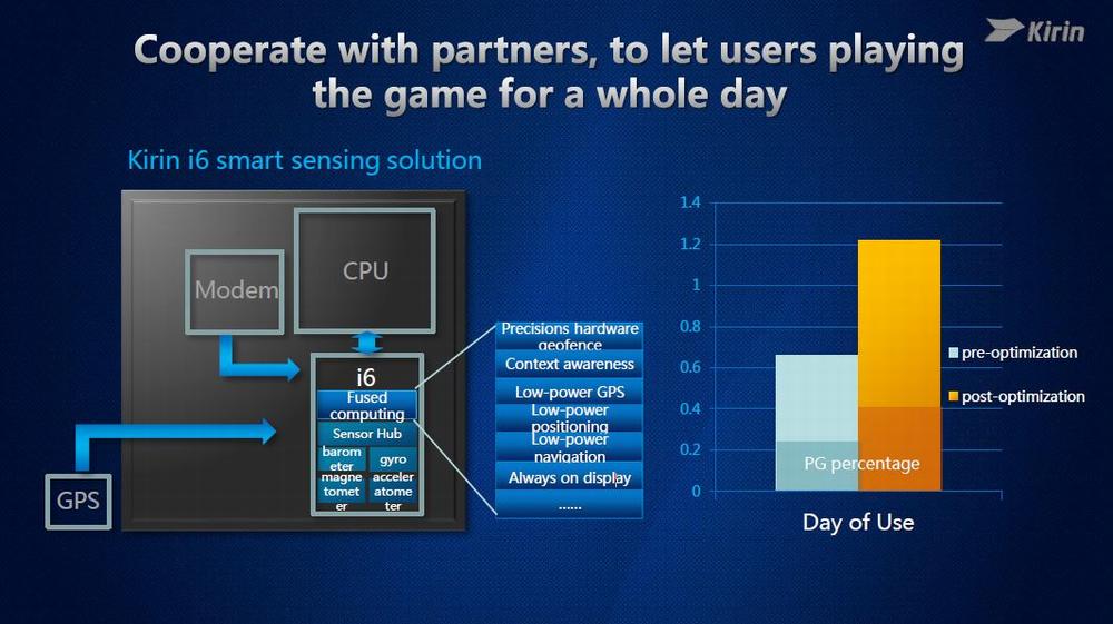 Основные преимущества сопроцессора i6 в том, что он отвечает за работу сенсоров устройства: гироскоп, барометр, маломощный GPS, акселерометр и т.д. Это позволяет смартфону, планшету или любому другому устройству потреблять вдвое меньше энергии, что положительно сказывается на времени жизни аппарата, при этом нагрев чипсета практически отсутствует. Данная технология уже давно используется в процессорах Apple, а вот для чипов Хуавей это новинка.